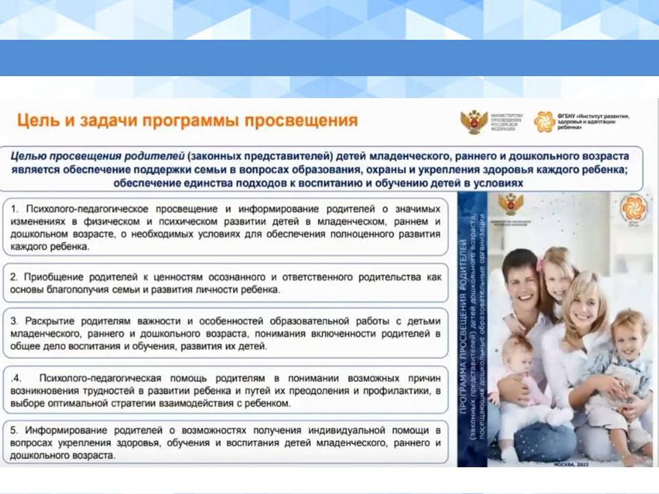 Просветительская деятельность выступает значимой частью профессиональной деятельности педагогов дошкольных образовательных организаций, одной из мер государственной поддержки семей, инструментом формирования единого образовательного пространства страны и позиции осознанного ответственного родительства.